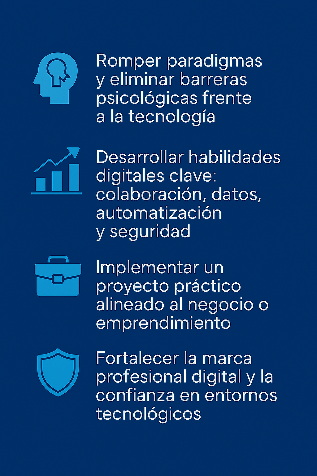 Con más de 12 años de experiencia en transformación digital, adopción tecnológica y liderazgo inclusivo, ha diseñado programas que han impactado a cientos de profesionales en Latinoamérica.